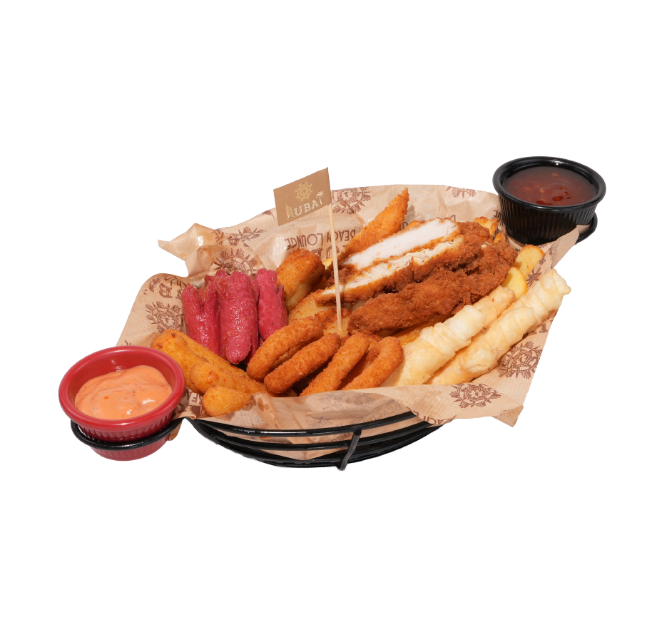 Patates cipsi, sigara böreği, sosis, mozzarella çubukları, nugget, soğan halkası, patates kroket, kokteyl sos, sweet chili sos.