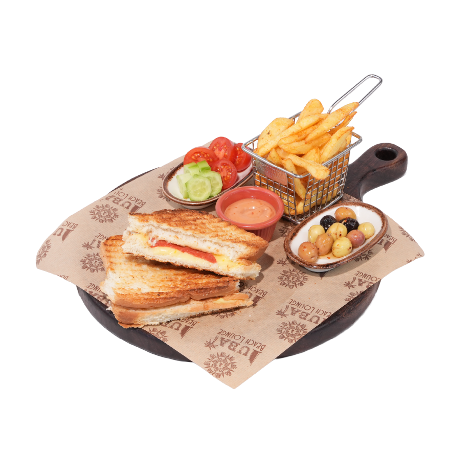 Ayvalık tost ekmeği içerisine; dilim kaşar.Domates, salatalık, zeytin, cips, kokteyl sos.