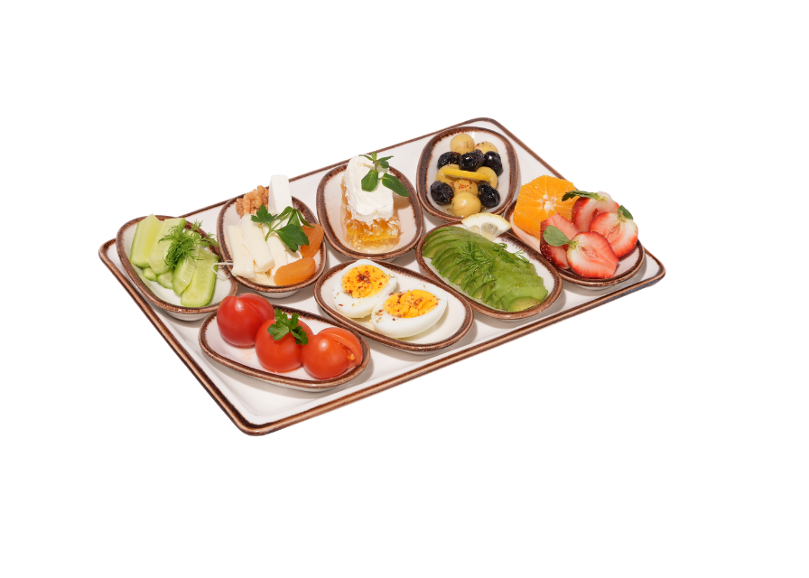 Beyaz peynir,Ezine peyniri,Çeçil peyniri,Yeşil zeytin,Haşlanmış yumurta,Domates,Salatalık,Bal kaymak,Avokado,Mevsim meyvesi.